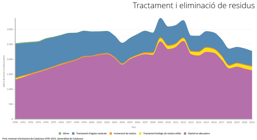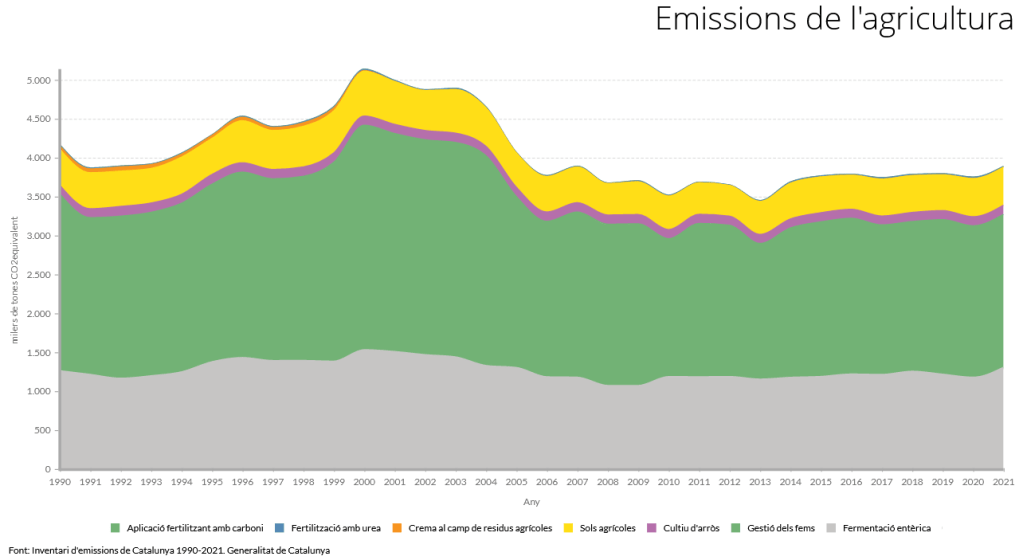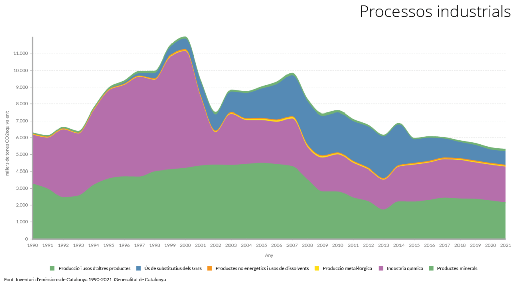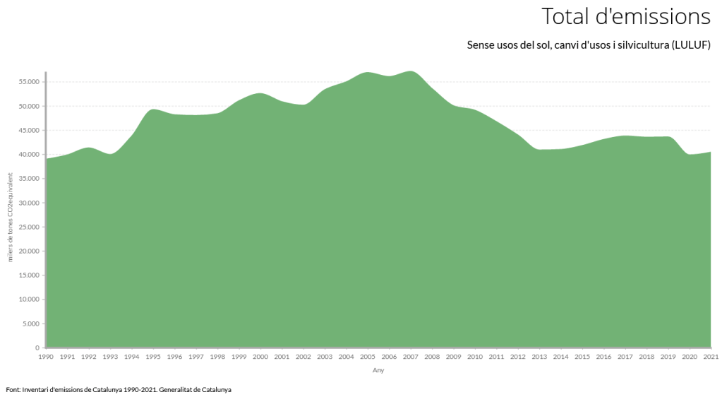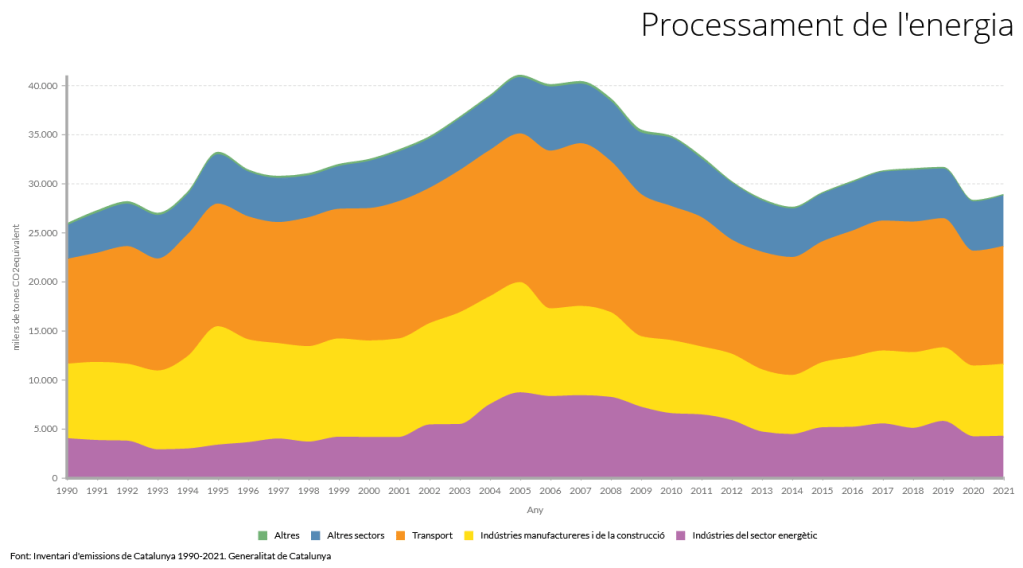 Els següents gràfics han estat realitzats a partir de les emissions obtingudes a l’Inventari d’emissions de Catalunya 1990-2021. Es classifiquen, per tant, en funció de les categories oficials i no inclouen per exemple factors rellevants per entendre el sistema socioeconòmic de Catalunya com les emissions associades als productes provinents de l’exterior.