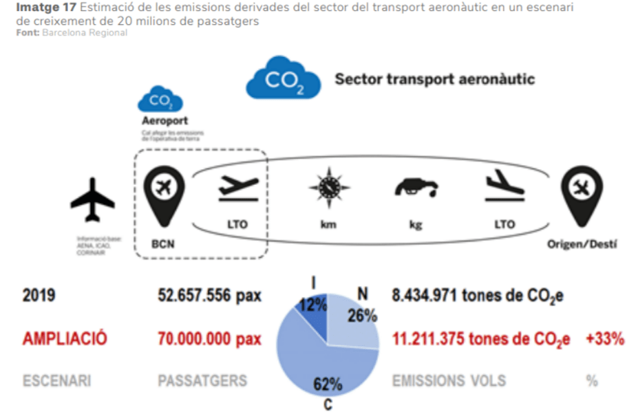 Un estudi de Barcelona Regional sobre l’ampliació de l’aeroport del Prat calculava unes emissions de més de 8,4 milions de tones de CO2eq anuals el 2019, quan l’aeroport va acollir més de 52,6 milions de passatgers. En un escenari de creixement fins als 70 milions de passatgers, les emissions creixerien un 33%, fins als més d’11,2 milions de tones de CO2eq, segons aquests càlculs.